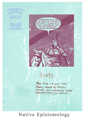 Native Epistemology and Edward Curtis’s Last Photograph were made simultaneously and have Tonto being transformed into an indigenous intellectual putting Curtis on notice that not only was his premise for his entire body of work wrong, but his ass is about to be kicked by some very put out Tlingit warriors. This still makes me laugh, and what makes it really sweet is that there is an historical truth to the lithographs too. Curtis never did make any significant photographs in Tlingit country, because of what likely happened in the Edward Curtis’ Last Photograph lithograph. Raven lives on, and I must say, he’s still having fun.